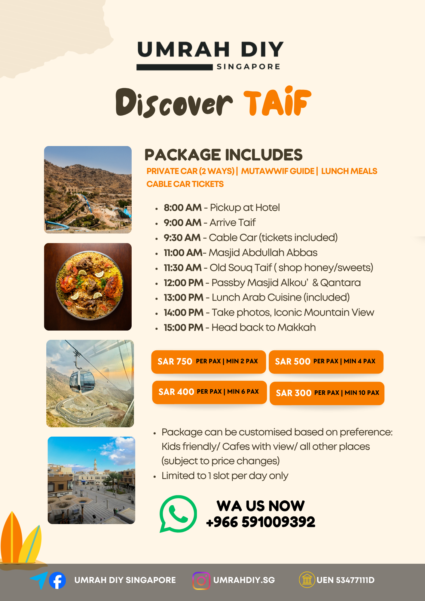 Product form Price is for per person 1-2 Pax price 3-4 Pax price 5-6 pax price 7-10 pax price $270.00 Quantity Add to cart This item is a recurring or deferred purchase. By continuing, I agree to the cancellation policy and authorize you to charge my payment method at the prices, frequency and dates listed on this page until my order is fulfilled or I cancel, if permitted. Once payment received, Admin will arrange with you accordingly.
